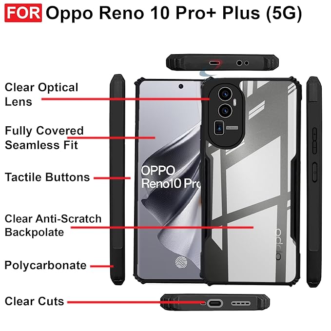 Looks : The Shockproof cover for Oppo Reno 10 Pro Plus 5G provides elegant look to your phone the back side of the cover is transparent which protect your phone from scratches where as the raised sides protect it from falls.